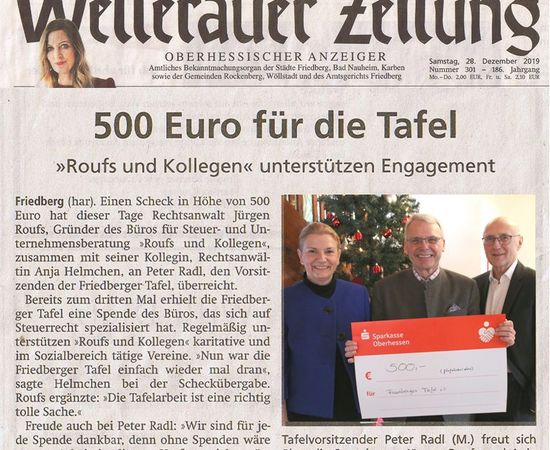 Auch wenn wir bundesweit Mandanten betreuen ist die Wetterau unsere Heimat. Die Region und ihre Menschen sind uns wichtig. Deshalb engagieren wir uns gerne mit Herz und Leidenschaft für soziale, kulturelle und sportliche Projekte
